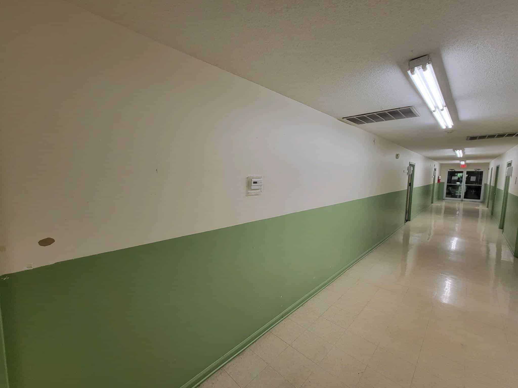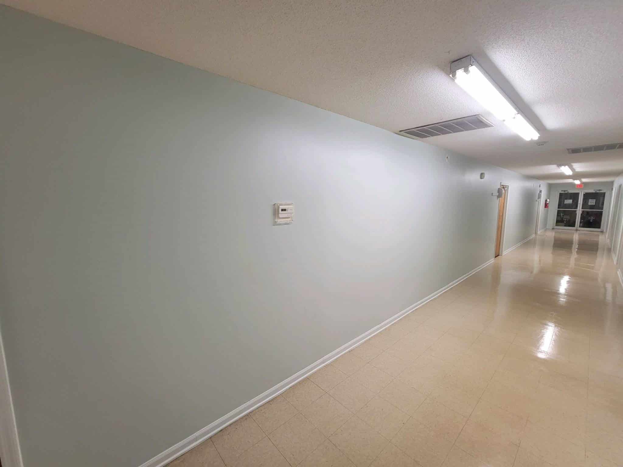 This commercial interior corridor with a full repaint focused on durability, clean lines, and improved light reflection. The drywall surfaces were prepped with patching, sanding, and spot-priming to repair wear from high-traffic use. We applied Sherwin-Williams ProMar 200 Zero VOC (eggshell finish) in a uniform soft gray to replace the outdated two-tone scheme, creating a brighter, more professional environment. Trim and door casings were finished in semi-gloss enamel for added durability and easy cleaning. The result is a consistent, refreshed area designed to hold up under daily activity while elevating the building’s overall appearance.